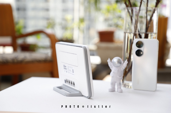 机身正面一条指示灯同时也起到装饰作用,正面的“HUAWEI”logo居中设计,即使把它当成普通的家用路由器摆在家中也很百搭。