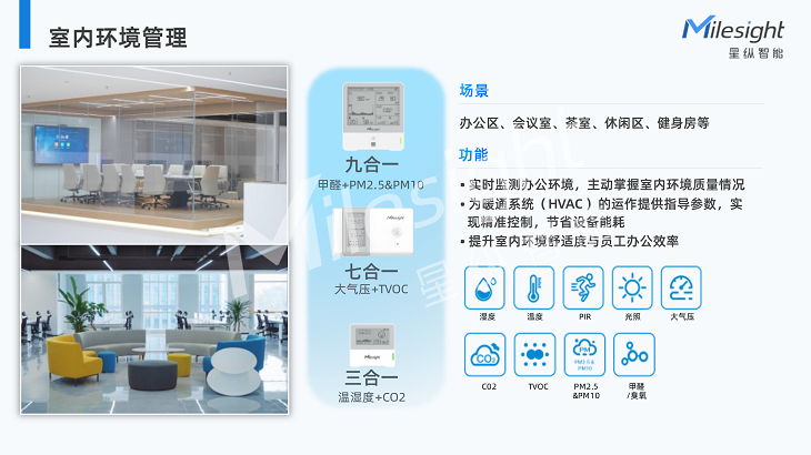 再次是环境管理方面,星纵智能大楼通过在不同区域空间部署环境监测传感器,实时监测空气中的有害气体,给员工提供一个健康舒适的工作环境。