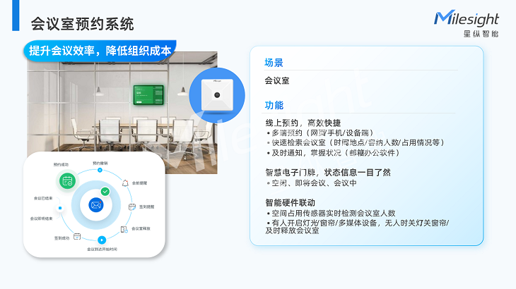 星纵智能的会议室预约系统能够帮助企业高效管理会议室,提升会议效率,降低组织成本。除了会议室,大楼还设有共享办公区,通过空间占用传感器检测工位是否有人,并在平台统一查看管理。