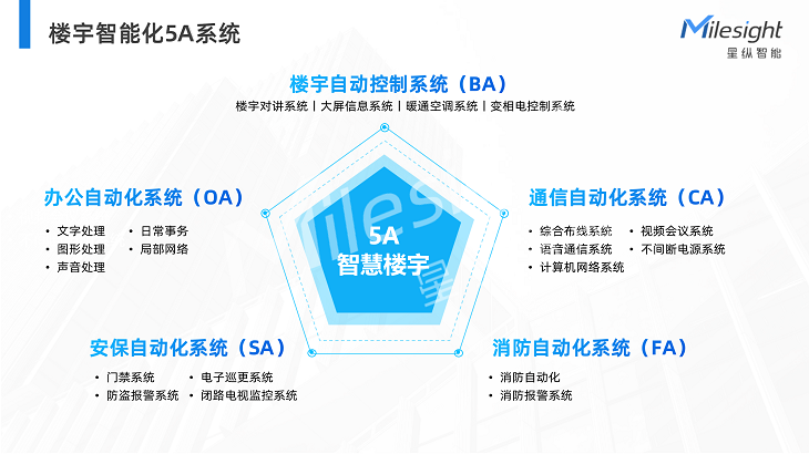 所谓5A,包括OA:办公自动化系统;CA:通讯自动化系统;FA:消防自动化系统;SA:安保自动化系统;BA:楼宇自动控制系统。
