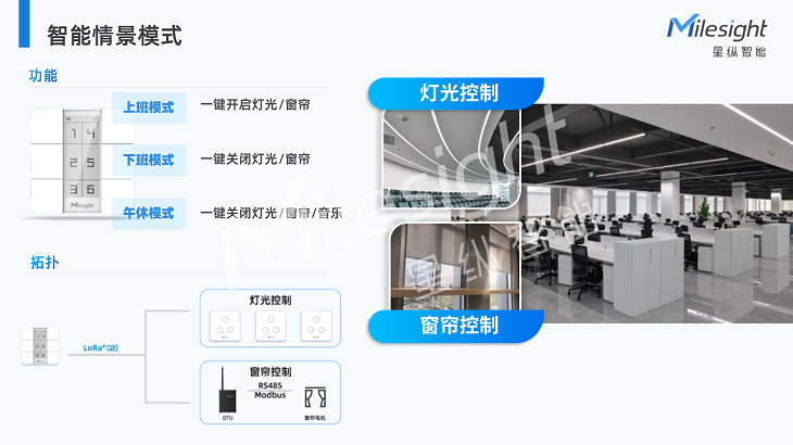 1)公共办公区域通过智能情景面板直接联动办公区的智能开关面板,实现对整栋大楼灯光的全局控制与分区控制。