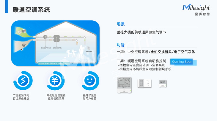 暖通系统的耗能优化是智慧楼宇非常重要的一环,因为暖通系统的耗电量很高,用电费用占比非常高。目前大楼一期已经实现对暖通系统的远程控制和管理。二期我们将通过环境数据指导暖通系统智能化运作。