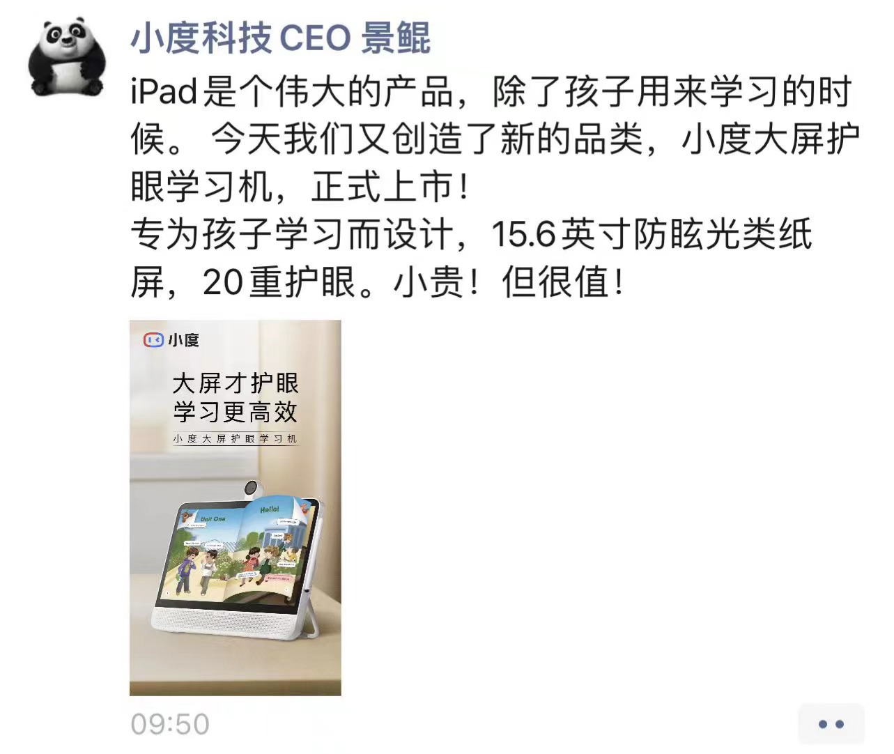 据了解,该产品是智能科技品牌小度联合眼科专家陶勇最新发布的【小度大屏护眼学习机】,它拥有15.6英寸大屏,比普通Pad类产品屏幕都要大。此外,它具备防蓝光、防眩光、抗视疲劳等多至20重护眼机制,以及AI精准学丰富学习工具和家长管控等功能。小度CEO借“国际爱眼日”发布的这条朋友圈,也加速了学生电子设备硬件以护眼为核心的角逐。