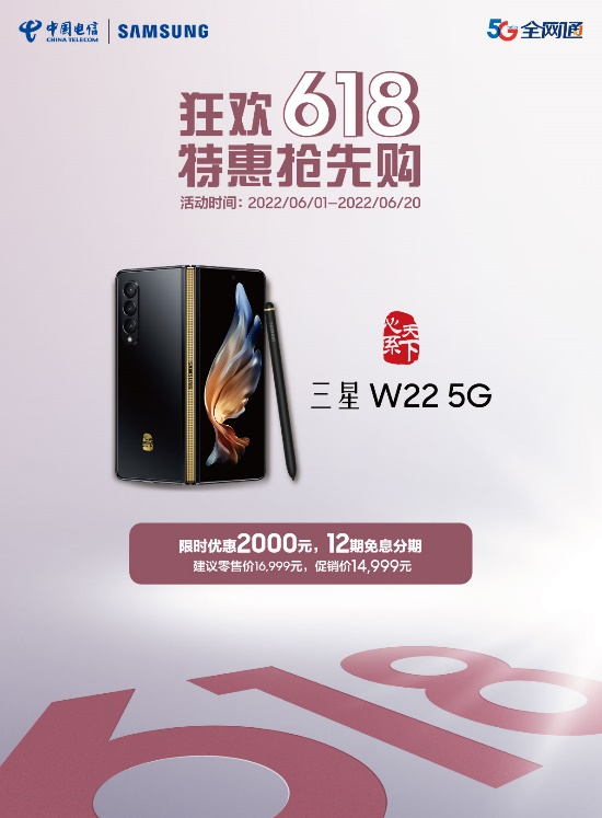 高端折叠屏手机心系天下三星W22 5G即日起至6月20日期间,限时优惠2000元,到手仅14999元,并支持12期免息分期。