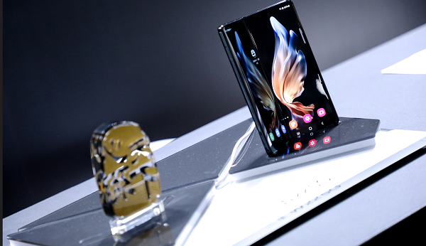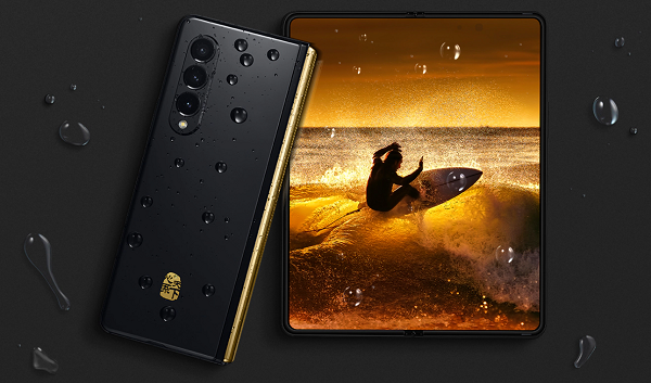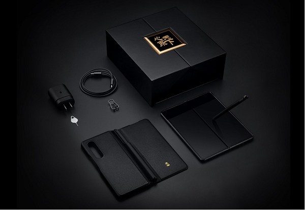 心系天下三星W22 5G于去年10月发布,整机采用黑金配色,背板为高温压铸、抛光、覆膜等多重特种工艺铸造的陶瓷打造,铰链部分为金色方案,机身背部印有“心系天下”金色Logo,彰显其折叠屏机皇的尊贵地位。