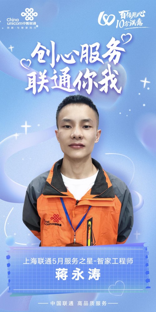 上海联通智家工程师蒋永涛从事宽带装维工作已7个年头了,他一直致力于提升专业技能,工作兢兢业业,受到了用户的认可,也是同事学习的榜样。