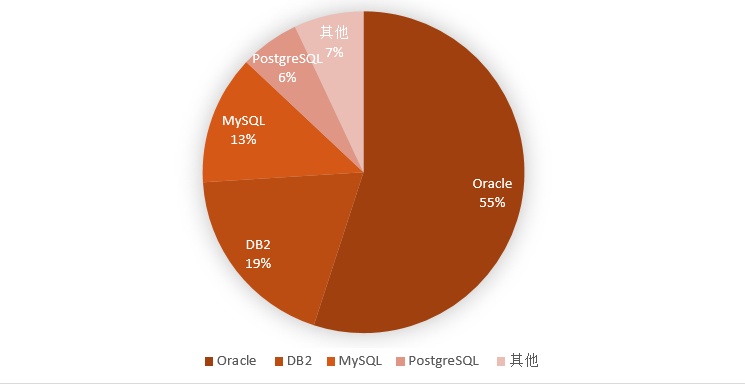 中国信息通信研究院《数据库发展研究报告(2021年)》指出,我国金融行业各类数据库应用占比为Oracle 55%、DB2 19%、MySQL 13%、PostgreSQL 6%,其他7%。