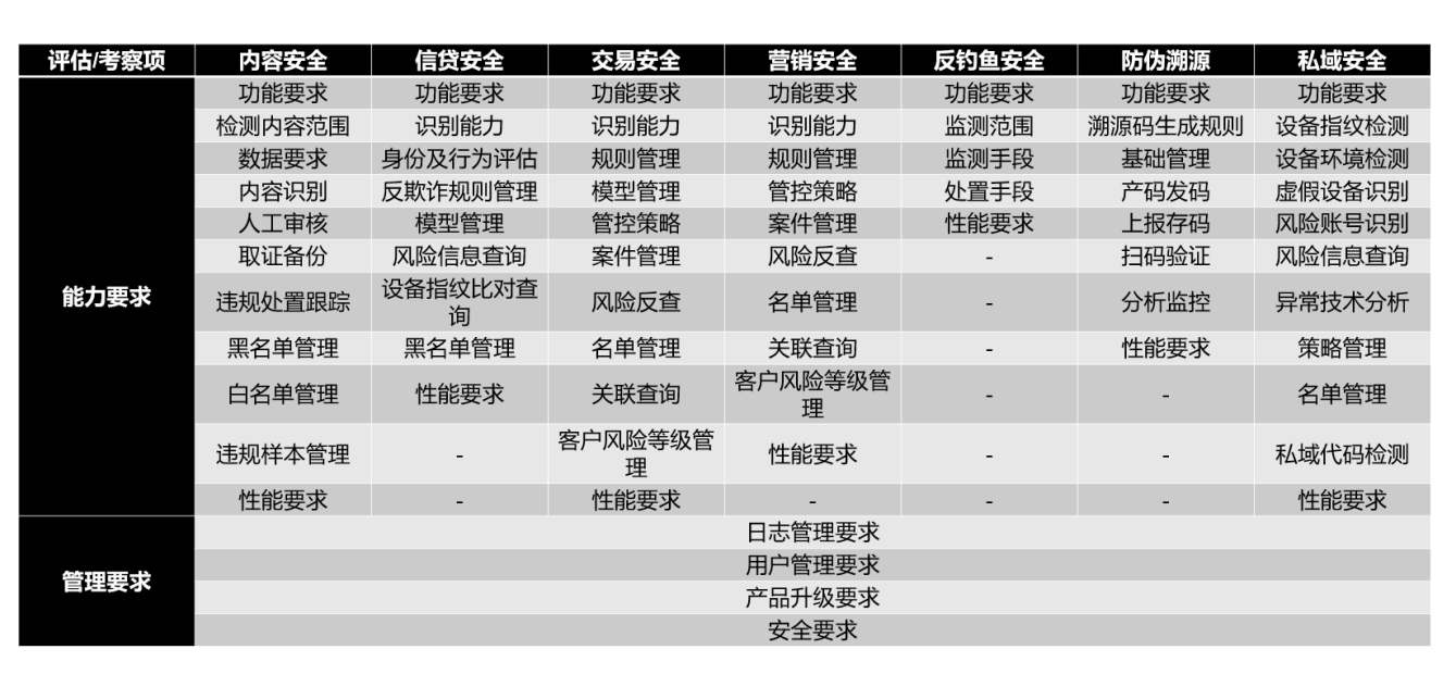 以“营销安全”为例。《业务安全能力要求》标准体系对营销安全的功能、风控技术、性能、产品自身安全功能等方面进行检验,风控技术包括数据识别、规则管理、管控策略、案件管理、风险反查、名单管理、关联查询、客户风险等级管理等。