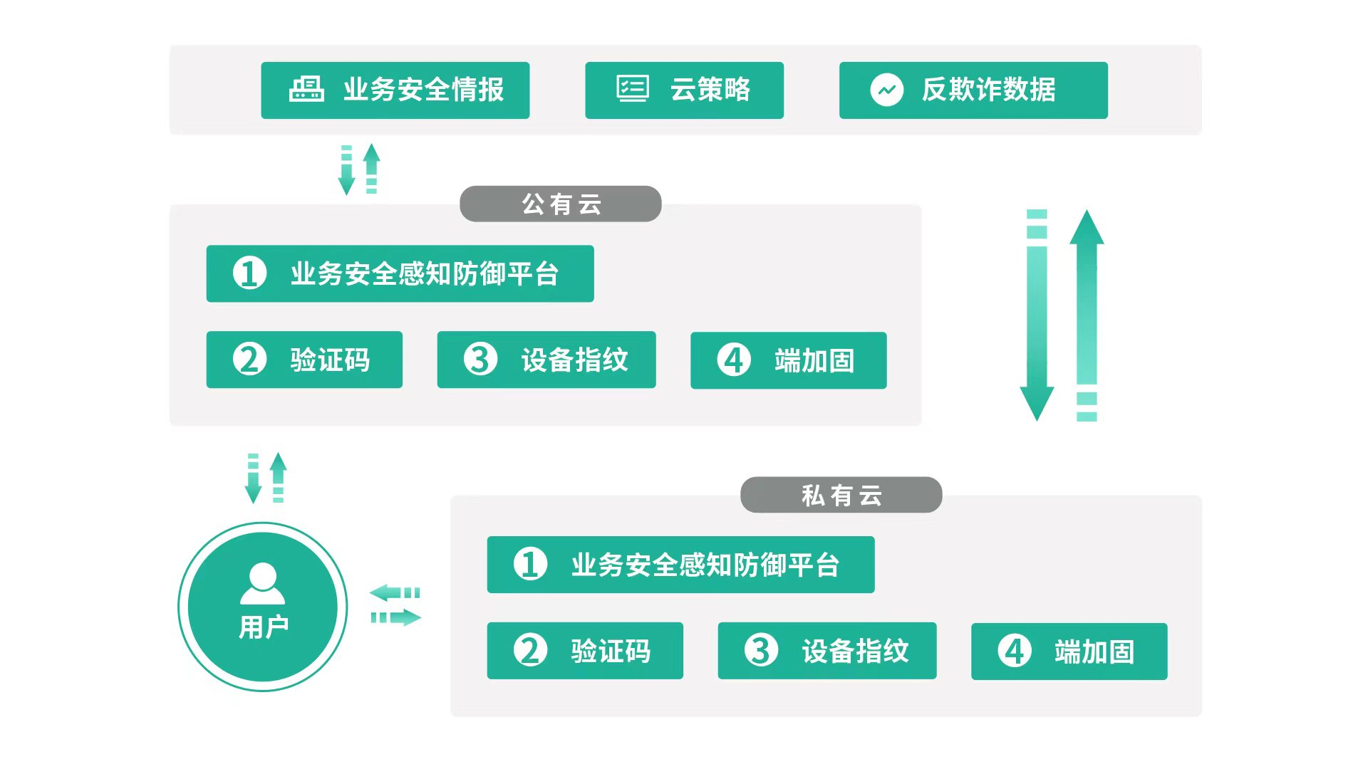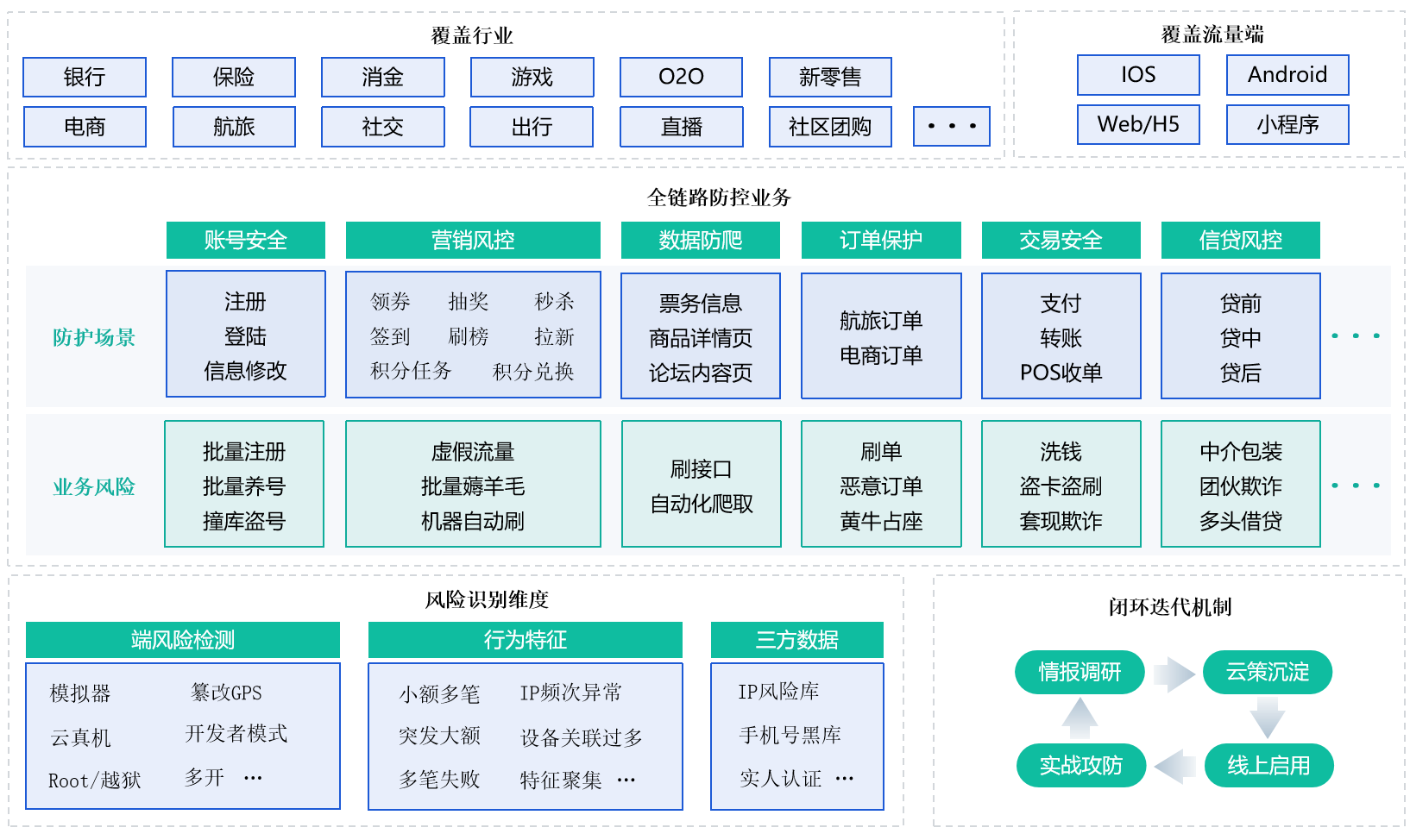 业务安全云具备设备真伪识别、行为验证、风险感知、高性能实时计算、高效的策略执行和攻击还原等六大能力能力。主要包含云和端两部分。其中,“云”作为业务安全经验的沉淀和决策依据的大脑,提供实时更新的业务安全情报、反欺诈相关的风险数据、具体业务场景的防御策略;“端”主要是在全链路多环节的业务交互中,提供安全工具和平台,利用云上的经验,实时识别到业务风险,并及时进行防御和处置。