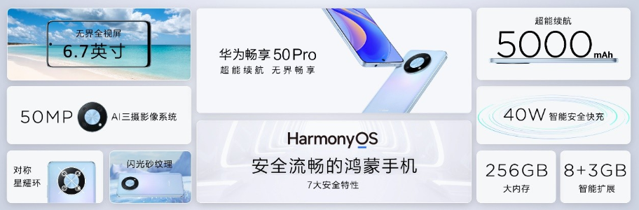 2022年7月29日,华为畅享50 Pro正式发布,采用直屏窄边框与质感星耀环设计,拥有星海蓝、翡冷翠、雪域白和幻夜黑四款配色。手机配备5000mAh超大电池、40W智能安全快充、5000万像素AI三摄影像系统、支持8GB+3GB HyperHold智能扩展。