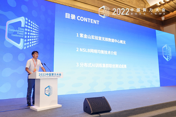 在山东济南举行的2022中国算力大会上,紫金山实验室研究员高新平作了“基于无损数据中心的AI训练网络均衡技术实践”的主题演讲。