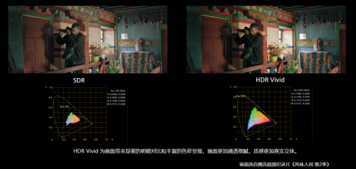 作为一个开放性技术标准,HDR Vivid标准显示效果远好于静态HDR方案,同其它动态HDR方案相比,呈现丰富色彩及层次,提高明暗对比,还可增强纵深感及细节,画面将更加趋近真实世界,通过广色域+高动态范围+动态元数据+智能映射(颜色/亮度),在不同显示设备上可以保证画质的一致性,最大化地还原创作者意图。
