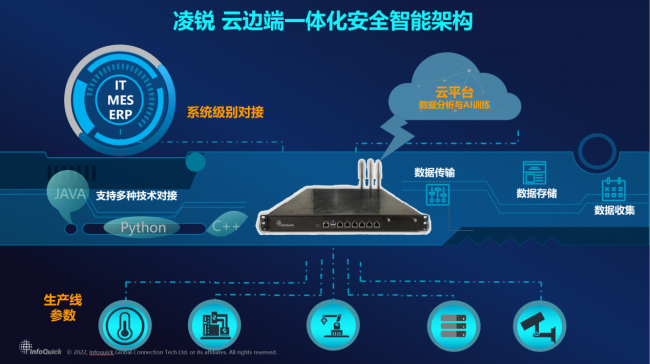 凌锐云边端一体化安全智能系统,对接企业ERP/MES系统,确认不同种类的订单,同时收集生产线各机台必要参数,如压力、电压、温度、包角、糊量等等,并将数据实时上传到云端进行分析,训练AI模型。AI模型实时回传到生产线后,根据不同订单要求,对上述参数进行动态调整,执行过程与末端的质量检测与修正,从而智能提高生产率特别是良品率(高达97%)。在整个过程中,无需人员干预,以此大大降低人员成本。由于边缘智能控制精度很高,因此耗能也可以被有效控制,减少不必要的能源消耗,降低成本同时保证双碳环保。