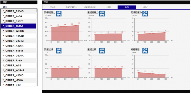 4,根据订单分析预生成执行工艺,在本系统中内置了由多年经验沉淀而来的纸板过程辅助决策系统,会针对每一笔订单每一张纸来进行分析,不仅包括传统意义的克重,也包括环切、耐破、边压、水分的计算考量。云端通过对订单、材质进行分析,对订单材质进行AI建模,通过随机森林算法,结合传感器采集与运行历史数据对模型进行训练,实现边缘侧设备工艺自适应迭代。