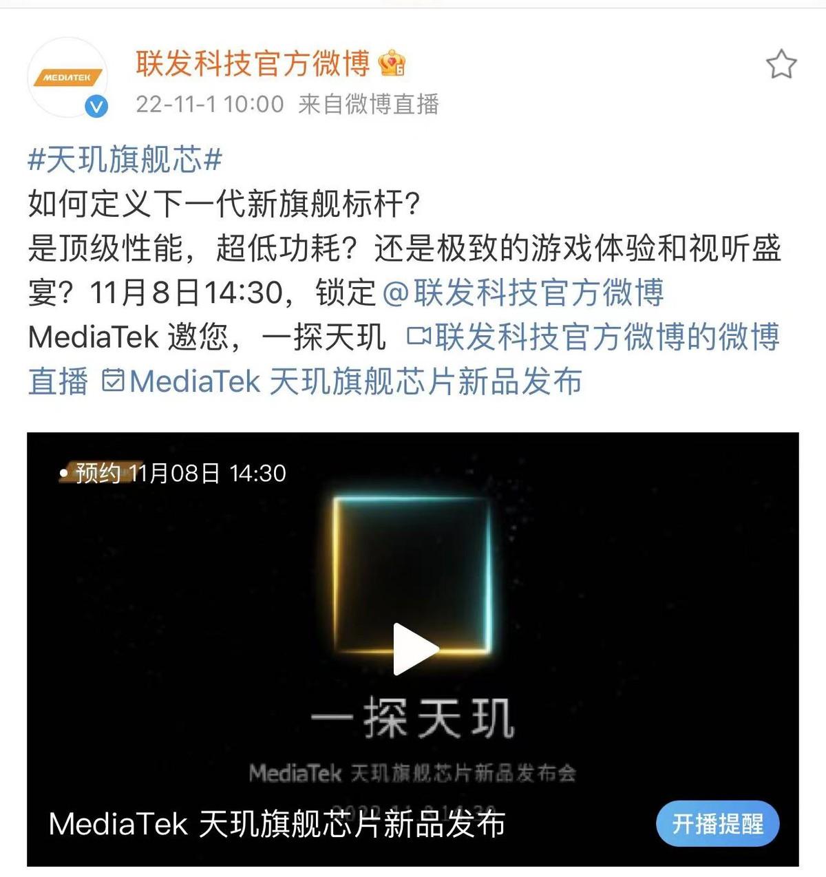 最近一段时间,有关联发科新一代旗舰芯片的爆料消息可谓是让整个移动市场一片火热,就在大家纷纷猜测新一代天玑旗舰芯片会在何时问世时,联发科技官方微博今天宣布天玑旗舰芯片新品发布会定档11月8日14:30。前不久,有关天玑9200 CPU、GPU跑分打破纪录的消息成为了数码爱好者津津乐道的话题,没想到这颗拥有顶级性能的旗舰芯很快就要与我们见面了。