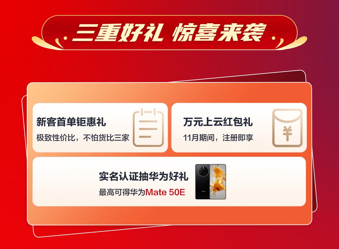 本次双11大促期间,华为云京东官方旗舰店为用户送上三重惊喜好礼,专属礼包、抽奖得华为手机等福利可谓诚意满满。