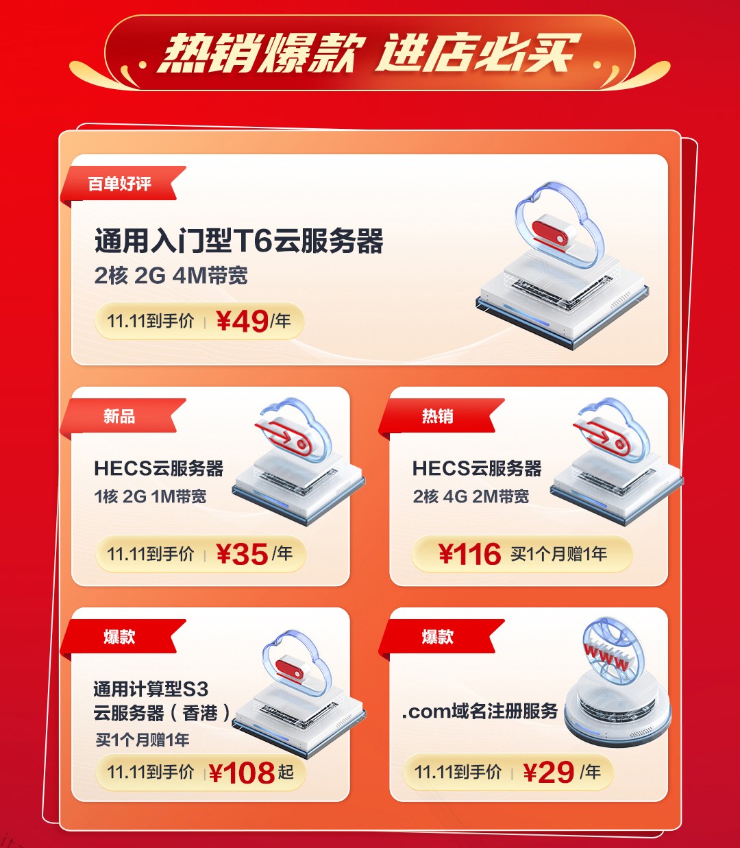 比如云服务器等热销爆款单品,在双11期间会以非常实惠的价格提供给企业用户。其中,可帮助用户打造安全高效的应用环境的通用入门型T6云服务器,2核、2G、4M带宽配置在双11期间到手价仅需49元/年;对于云上开发必选的HECS云耀云服务器,1核、2G、 1M带宽配置仅需35元/年,2核、4G、2M带宽仅需116元,买1个月赠1年;通用计算型S3云服务器(香港)双11到手价仅需108元起,更可享受买1个月赠1年的超值特惠;.com域名注册服务在双11期间到手价每年仅需29元。