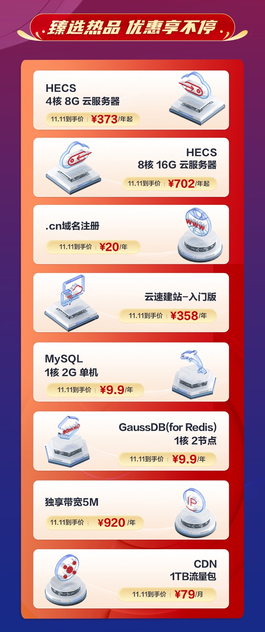 实惠更实用,“11”都如愿,华为云双11活动已正式启动,即刻关注京东华为云官方旗舰店,立享三重好礼和精选热门产品折扣,有上云需求的小伙伴们快快行动起来!