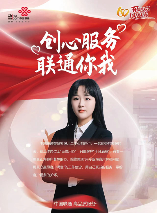 有这样一群人,他们在自己的工作岗位上“百倍用心”,只愿客户“十分满意”,他们自进入联通公司以来,始终秉承着用专业为客户解决问题,用真心赢得客户满意的工作信念,收获了一批又一批客户的信任。就是这样一群平凡的人,用自己最真诚的服务,带给客户更多的关怀与满意。今天的主人公刘佳伊,来自于中国联通智慧客服北方二中心,一位平凡且真诚的客服代表,在日常的工作中,她总是能够把用户的感知放在第一位,急客户之所急,想客户之所想,时常会听到她说,服务在行动上,只要用户满意就可以,为我们树立起很好的榜样,当选为本期服务之星。