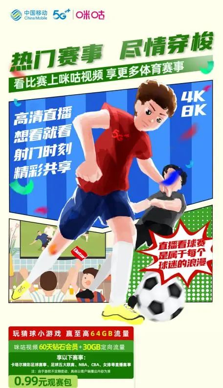 每逢体育盛会,移动都会推出丰富的权益活动助力观赛,本次还创新推出“0.99元观赛包”活动。移动用户通过短信发送099到10086,或下载“咪咕视频”App,只需0.99元即可办淘宝价值45元的会员套餐,享受60天咪咕视频会员+30BG定向流量,在这里不仅可以观看最全场次、最流畅观看体验、最强解说阵容的世界杯赛事,同时还可看芒果会员付费内容,各大热剧、热门综艺超多好内容尽在其中。