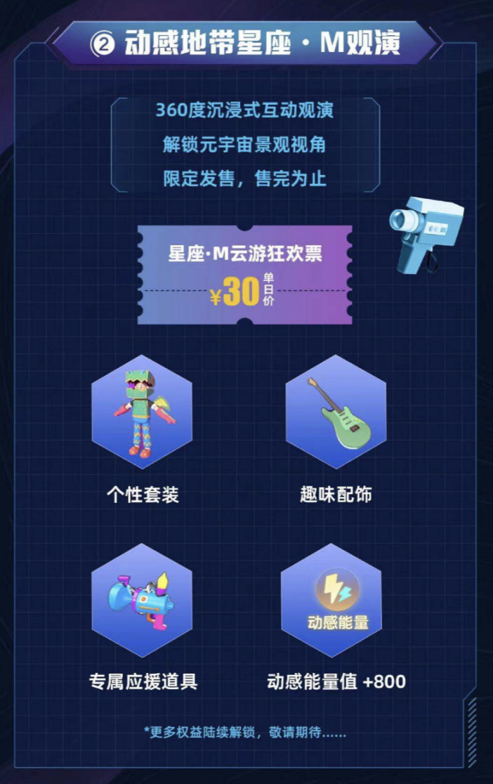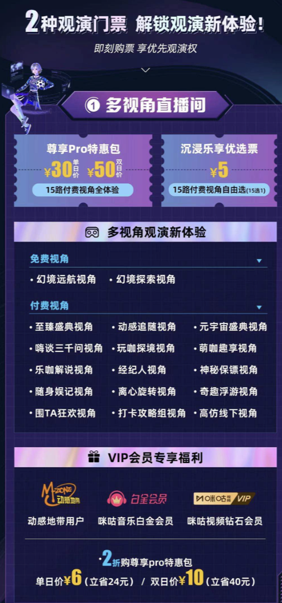 本届盛典将在12月世界杯期间分两场举办,设有沉浸乐享优选票、尊享pro特惠包和星座·M云游狂欢票三档。沉浸乐享优选票用户可选择15路付费视角的任一视角,尊享pro特惠包可尽享15路付费视角包,星座·M云游狂欢票用户则能进一步开启景观视角。