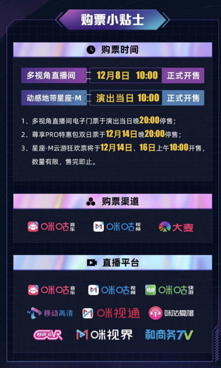 观演门票可通过咪咕音乐、咪咕视频和大麦网三大渠道购买。售票时间为12月8日上午10时后,动感地带星座·M在12月14日、16日演出当日10时开售。