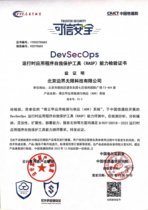 中国信通院为进一步提升软件供应链透明度,积极应对不断出现的软件供应链安全治理难题,同时为用户选择合适的厂商及产品提供选型指导,启动了“软件供应链厂商和产品名录”征集评选活动,评选出了一批成熟度高、具有示范作用的优秀案例。边界无限靖云甲ADR应用检测与响应系统,凭借其出色的技术能力与表现,成功入选至信息安全软件领域,推进软件供应链安全产业发展,助力企业提升自身安全能力,并进而建立整体应用防护体系。