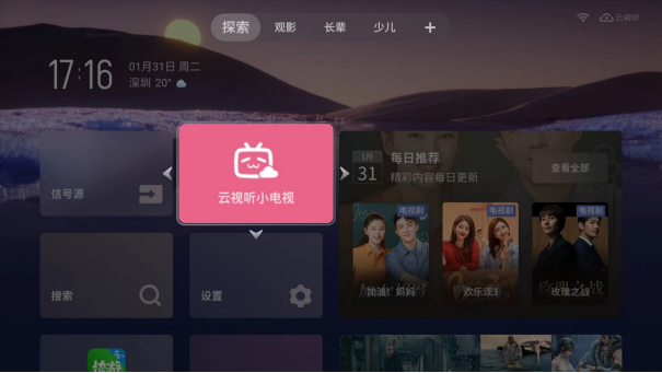 具体说来,我们可以根据自己的使用习惯,自由组合电视桌面小组件,不仅有影视相关小组件还有天气预报等,让电视桌面和手机屏幕一样智能、个性化;而且灵控桌面拥有分身系统功能,可以根据家庭成员打造专属桌面,家里有小孩、老人一起生活的话可以分别设置专属系统。