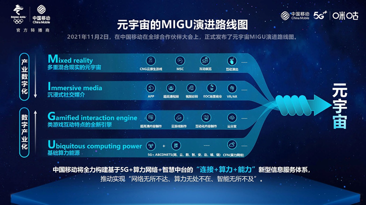 作为科技创新国家队、数字经济主力军、新媒体国家队主力军、沉浸式媒体先锋队,中国移动咪咕公司致力于通过内容+科技+融合创新,满足用户的美好生活需要。“我们将沿着元宇宙的MIGU演进路线图,依托5G+算力网络+智慧中台的‘连接+算力+能力’新型信息服务体系,携手各方伙伴,助力强国梦早日实现!”向阳表示。