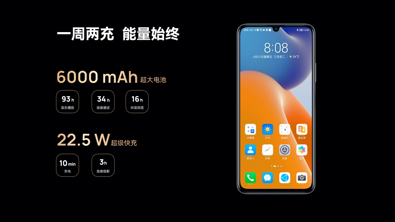 在续航体验方面,Hi 畅享 60 5G搭载 6000mAh 大容量电池,搭配 22.5W超级快充,带来一周两充的的畅快续航体验,并能有效满足应急场景需,充电10分钟,即可连续观影3小时,低电量时出门,也可利用碎片时间快速给手机充满电量。此外,Hi畅享60 5G还支持对手表、手环、手机等设备进行 12W 有线反向充电,帮助用户摆脱电量焦虑,出行无忧。
