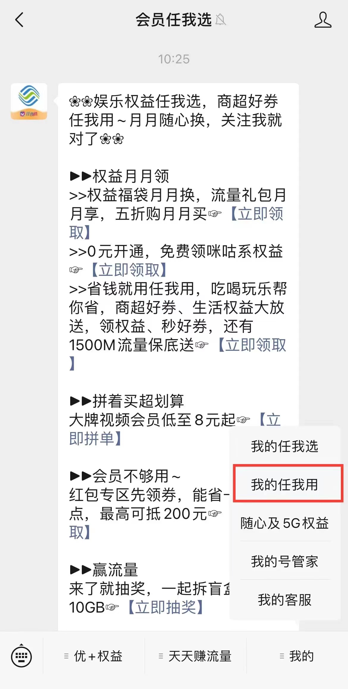 另外,微信公众号也可以领取。通过中国移动微信公众号菜单栏中的“我的”,点击“我的任我用”,即可领取“任我用”权益会员。