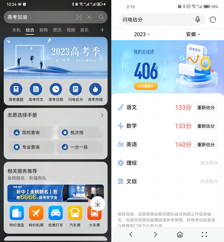 今年高考期间,华为智慧搜索在第一时间上新了真题试卷与答案,考生在桌面下拉搜索弹出的高考专属智能搜索服务界面,一键打开估分工具,通过选择高考年份、科目,即可查看本届真题,输入记忆中填写的答案进行智能估分,不用手动统计,避免误差更方便。