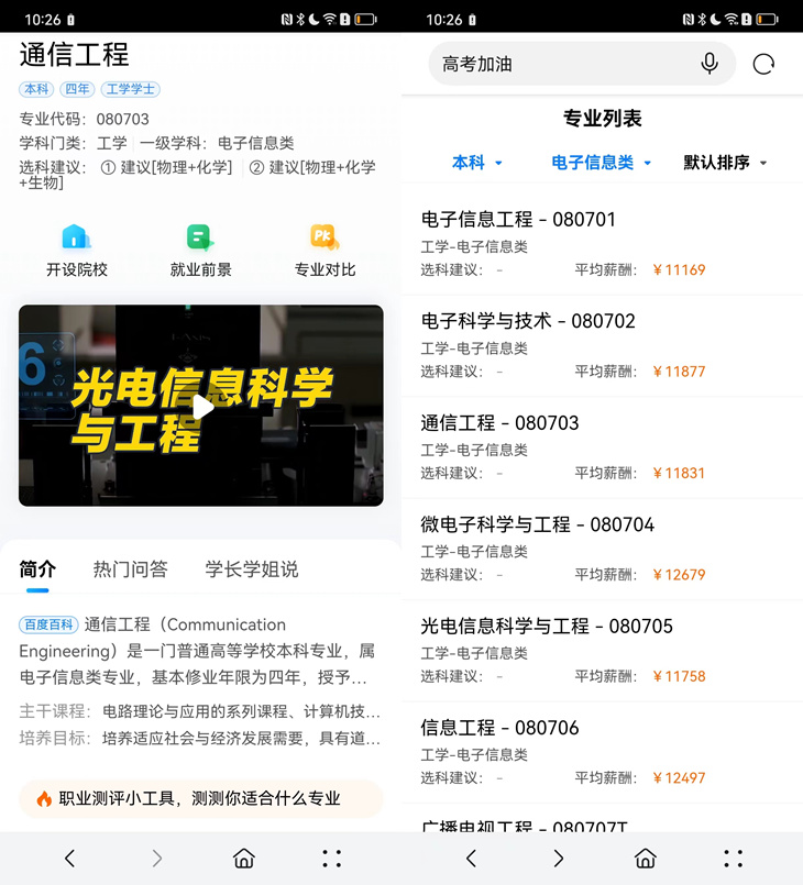 估分准备阶段,可以先提前确定报考专业范围。每年报考时,年度热门、冷门专业等各类消息层出不穷,难免干扰考生们的志愿选择,尤其面对部分难以分辨名称的专业。华为智慧搜索高考专题就可以查到目前国内院校所开设的所有专业类目和具体名称,进入详情页还提供课程介绍、开设院校、就业前景、平均薪酬等参考信息,考生还可以通过专业智能对比分析后再具体选择,避免正式开报志愿后满头雾水。