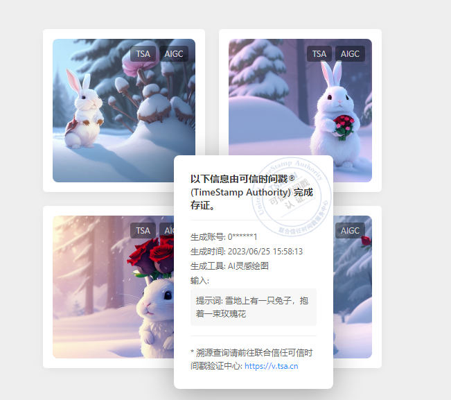 其次,联合信任会对AIGC进行可信时间戳认证,即使用联合信任的知识产权保护系统为AIGC签发一个司法认可的可信时间戳认证证书,证明AIGC的生成时间、权属和内容完整性。无论该内容在何处被使用或传播,都可以通过可信时间戳验证平台对其进行验证,为AIGC颁发一个不可篡改和伪造的“电子出生证”。这样就解决了AIGC平台所产生内容的权属和责任认定等问题。