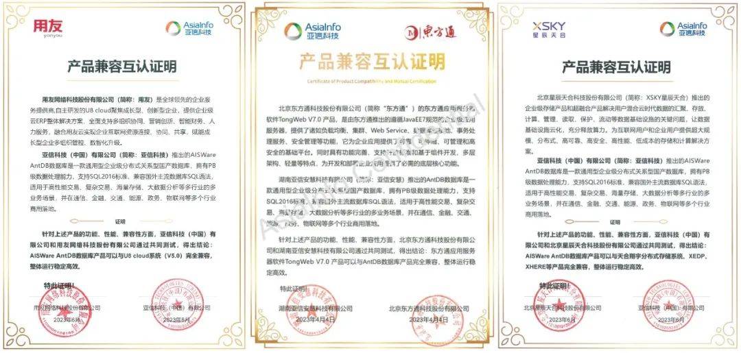 近日,亚信科技AntDB数据库与用友U8 cloud、东方通应用服务器TongWeb V7.0、星辰天合全产品体系完成兼容适配。经测试,AntDB数据库与U8 cloud产品,TongWeb V7.0服务器,星辰天合天合翔宇分布式存储系统、统一数据平台XEDP、超融合平台XHERE完美适配兼容,运行平稳高效,标志着亚信科技在信创生态布局进程上迈出了重要一步。