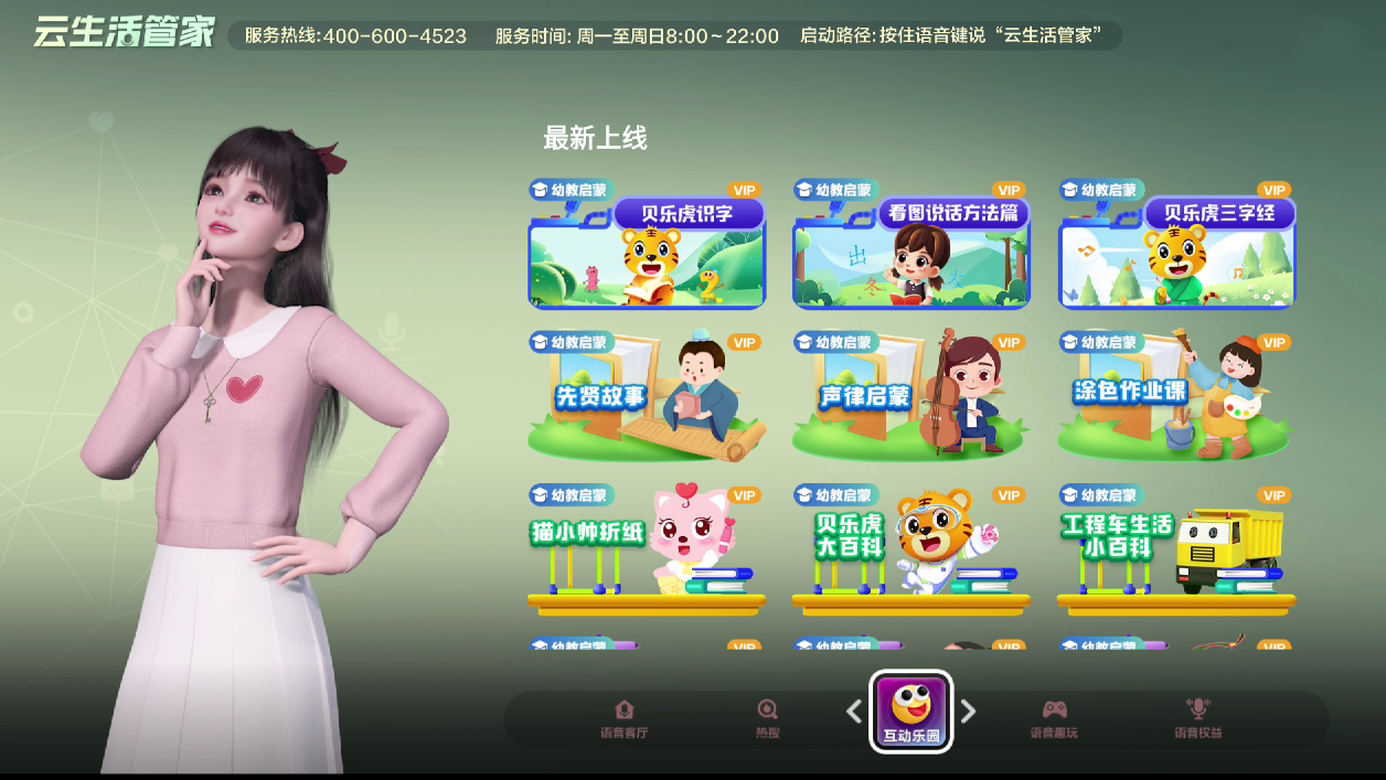 面向3-6岁学龄前儿童,小佳还会化身家庭教师,为孩子们提供居家场景下的启蒙教育服务。云生活管家产品内上线了多款互动绘本及交互卡通,以绘本/交互卡通为载体,结合科大讯飞的智能语音技术,打造交互式的阅读方式,让孩子在与绘本内容互动过程中快乐学习,认知世界。跟着语音读,对着电视学,帮助孩子一站式启蒙。