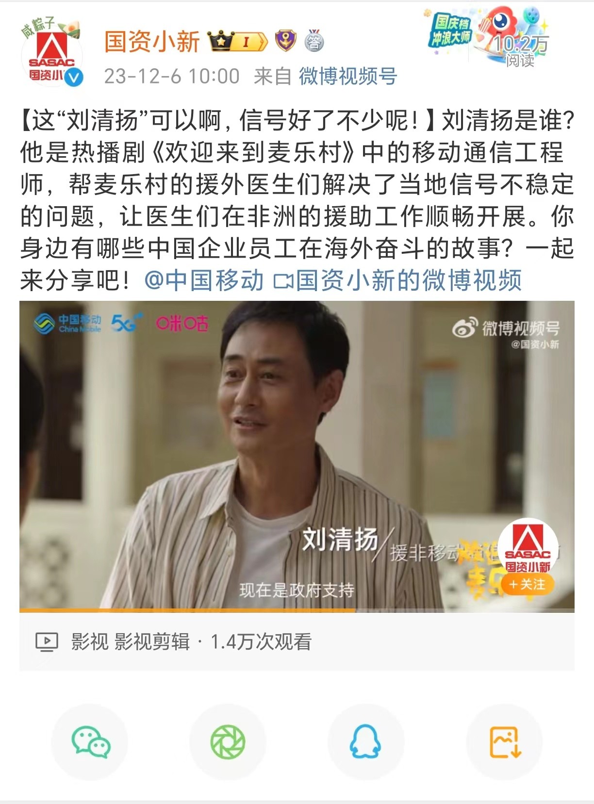 扎根生活和职业的细节,真实呈现中国人在海外建设中的鲜活图景,这也引发国资委新闻中心关注,发布《欢迎来到麦乐村》相关视频,点赞刘清扬这一角色,并号召分享中国企业员工在海外奋斗的故事。视频中体现了他为中国援外医生们解决燃眉之急,更通过信息通讯技术增强了非洲国家的互联网建设,展现了来自各行各业团结一心,共创美好,再次引发了网友的热议。