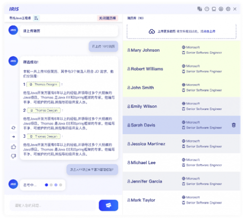 IRIS的智慧对话功能不仅仅是一个简单的查询工具,它代表了一个全新的交互式人才发现系统。通过先进的自然语言处理技术,HR专业人员可以像与真人一样与这个系统对话,提出具体的招聘需求。IRIS能够理解复杂的查询,并基于其庞大的数据库和学习能力,提供精准的候选人推荐。这大大提高了寻找理想候选人的效率和准确性,使得人才发现变得前所未有的简单快捷。