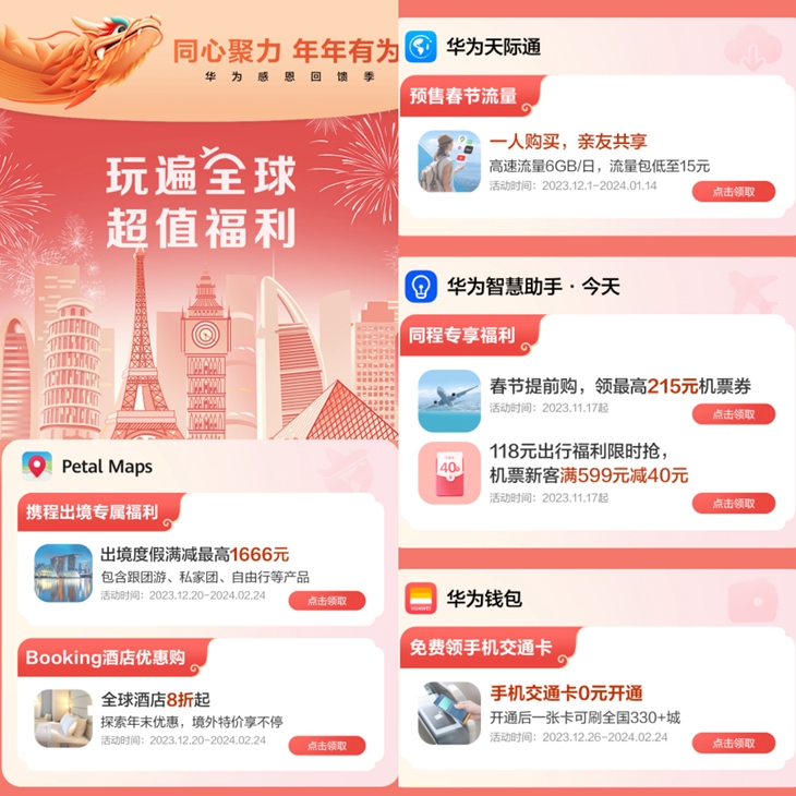 除了新版本重磅升级外,在2024年的元旦春节即将到来之际,华为用户玩转全球可享受多重福利。Petal Maps、天际通、智慧助手·今天、华为钱包、Petal出行等应用开启感恩回馈季超值优惠活动。在12月26日-2月24日期间,打开Petal Maps首页引导词“超值福利玩遍全球”或通过语音唤醒小艺,说“出国玩”进入活动页,即可享受全球酒店88折优惠,出境度假满减最高领取1666元的专属等福利!华为天际通高速流量提前购,高速流量6GB/日,低至15元,一人购买全家共享等等。