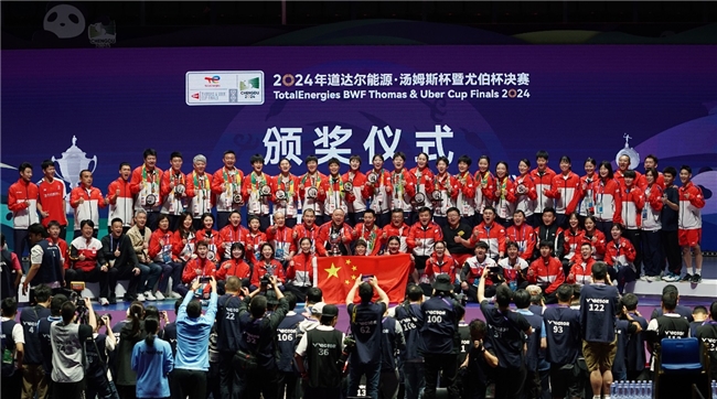 5月5日,2024道达尔能源·汤姆斯杯暨尤伯杯圆满收官,中国羽毛球队顽强拼搏,男队与女队双双登上2024道达尔能源·汤姆斯杯暨尤伯杯的最高领奖台。这是中国羽毛球队参赛历史上第11次捧起世界羽毛球男子团体锦标赛最高荣誉汤姆斯杯,第16次捧起世界羽毛球女子团体锦标赛最高荣誉尤伯杯,也是时隔12年中国羽毛球队再次同届比赛包揽汤尤双冠。继去年5月苏迪曼杯赛实现三连冠后,国羽再创独揽羽坛三大团体冠军奖杯的壮举。