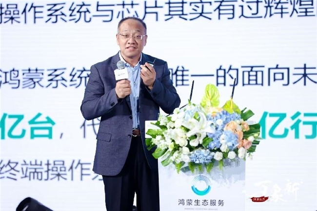 在分享环节,主办方鸿蒙生态服务公司总经理杜金彪表示说:“鸿蒙生态经历近年来的高速成长,今天原生应用已经超过4000+,鸿蒙生态设备超过了8亿台,开发者超220万人,鸿蒙系统在中国市场上的份额已经超过了15%,成为了第三大系统,鸿蒙生态已经枝繁叶茂。”