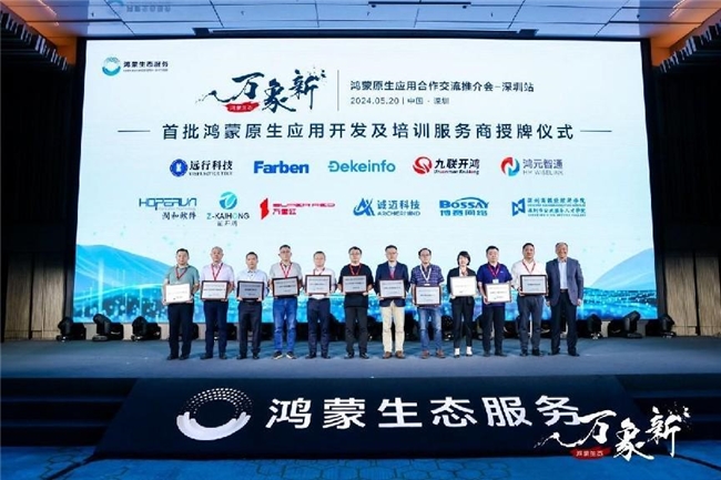 接下来会议举行了隆重的授牌仪式,由鸿蒙生态服务公司杜金彪总经理给首批鸿蒙原生应用开发及培训服务商授牌,掌声雷动气氛热烈。22位合作服务商在众人的瞩目中依次走上台接受牌匾。牌匾上印刻着“鸿蒙原生应用开发及培训服务商”的字样,象征着他们与鸿蒙生态服务公司紧密合作的伙伴关系,也预示着他们将在鸿蒙生态系统中发挥重要作用。随着鸿蒙生态系统的不断发展和壮大,这些合作服务商将扮演着越来越重要的角色,共同推动鸿蒙生态系统的繁荣和发展。