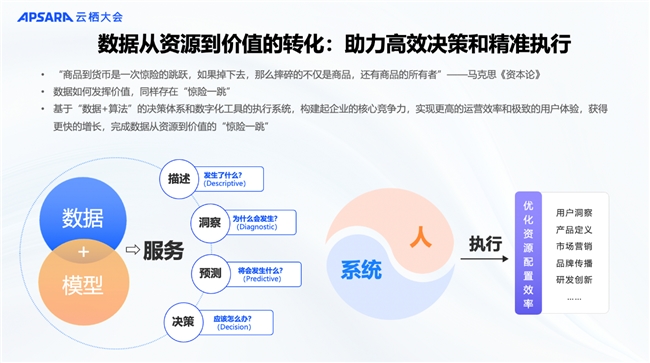 毛波认为,AI将在企业数据资产化转为价值化中起到决定性作用,如何通过Data xAI驱动高效决策和精准执行是关键。他引用了马克思《资本论》中的“惊险一跳”观点,强调了数据价值转化的重要性——基于“数据+算法”的决策体系和数字化工具的执行系统,构建企业的核心竞争力,实现更高的运营效率和极致的用户体验,获得更快的增长,最终完成数据从资源到价值的“惊险一跳”