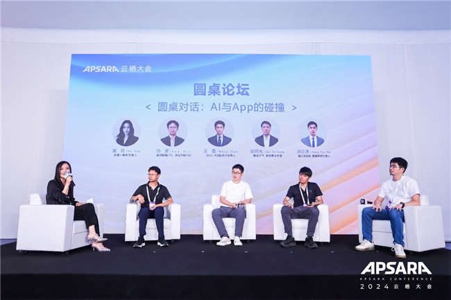 在论坛最后,来自澎湃新闻、B612、墨迹天气、通义实验室的专家齐聚一堂,就“AI与App的碰撞”这一话题展开了深入的讨论。他们各自分享了在AI应用上的实践经验,探讨了AI技术在提升用户体验、优化性能监控、内容创作等方面的潜力和挑战。