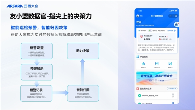 9月20日,友盟+在2024云栖大会上举办了“AI赋能开发者:构建新一代智能化工具,加速业务增长”专场论坛。瓴羊副总裁、友盟+业务负责人毛波在会上为开发者带来了3款全新的结合AI技术的开发者工具(U-Push、U-APM、友小盟数据官),并发布了“友小盟数据官” 智能看数小程序,通过AI的结合,实现自动化分析用户行为数据、智能识别关键指标,并提供预测分析,助力开发者快速做出更加精准的业务决策。