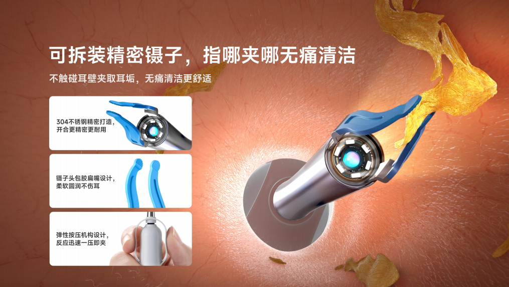 针对儿童耳道健康的特别关注,bebird 3在细节设计上更显贴心。刻度防护塞保护,精准控制入耳深浅,家长不必担心误伤孩子的耳朵;不碰触耳壁的镊子设计,避免反复刮挖孩子的娇嫩耳壁;可弯折定型的镜头套管,能灵活深入贴合孩子的弯窄耳道;边看边挖的可视功能,很好地消除了孩子的害怕心理,使其更加配合家长的清洁工作。