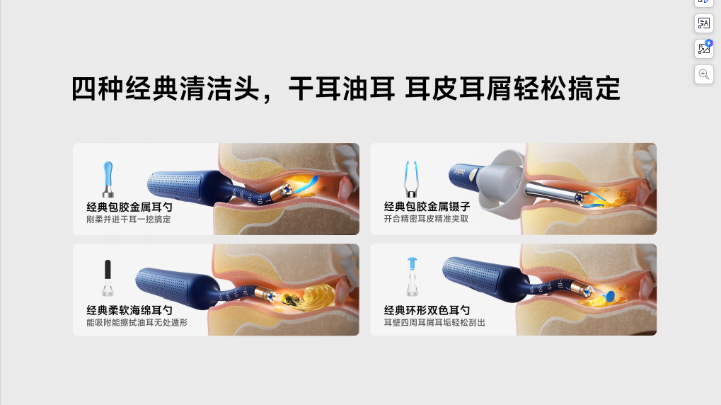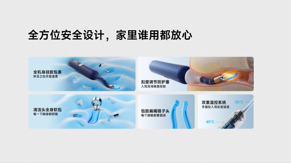 同时,bebird 3配备了可拆卸设计的精密镊子,由锌合金精密打造,耐用且精度高。镊子头部分采用包胶扁嘴设计,柔软圆润,有效保护稚嫩的耳道内壁。遇到那些夹取难度比较高的耳皮耳垢,bebird 3还能依靠镊子的弹性按压机构设计,一压即夹,不接触耳壁直接夹取,真正实现无痛清洁,无论大人、儿童使用起来都更舒适。不仅是镊子头,拿到手才发现bebird 3全机身硅胶包裹设计,“温柔”质感尽显,在手感出众的同时也保证了耐用性。另外它还有双重温控系统,无论是手握之处还是入耳部分,都可以提供一种舒适的温热感,让挖耳这件事变得更有温度,让人更舒服。经过无数次市场检验,保留了最常用的四款经典清洁头配件,包括刚柔并济的经典包胶金属耳勺、针对油耳能吸附和擦拭的经典海绵耳勺、上面提到的开合精密耳皮精准夹取的经典包胶金属镊子以及可以轻松刮出耳屑的经典环形双色耳勺,让不同耳道类型和耐受度的家庭成员各取所需。同时再搭配高级卫生的收纳仓使用,无论取用还是出差携带都非常方便。
