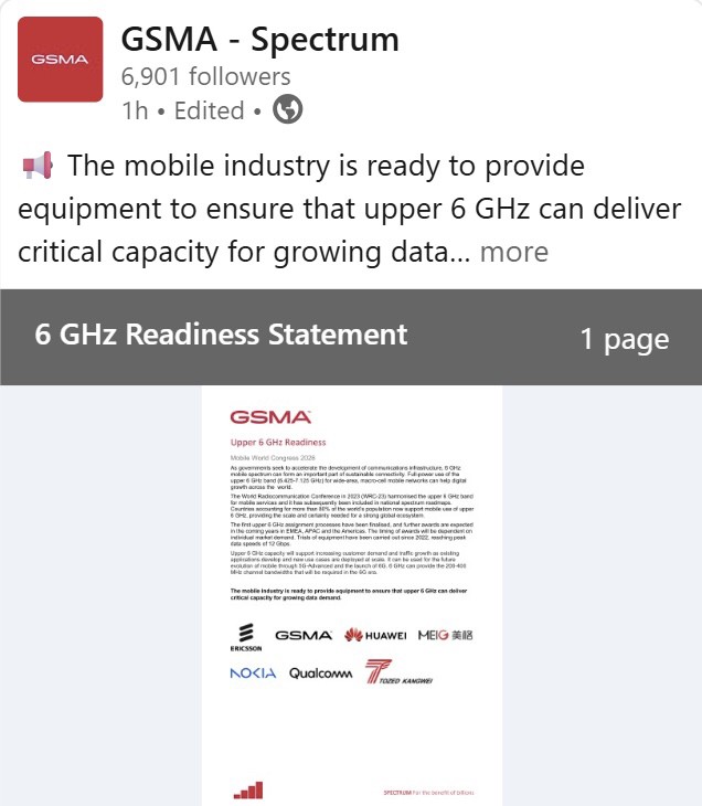 GSMA – Spectrum官方社媒渠道发布U6GHz成熟度说明