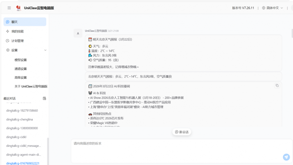中国联通云智电脑接入国内专属Skill Hub市场,预置办公自动化、资讯整合等优化工具包,拖拽式操作即可快速构建专属工作流,无需代码基础即可快速定制专属智能体功能。从文档生成到流程自动化,可深度适配办公、创作、日常处理等各类场景,都能一键响应、高效执行,真正做到全场景无缝适配。