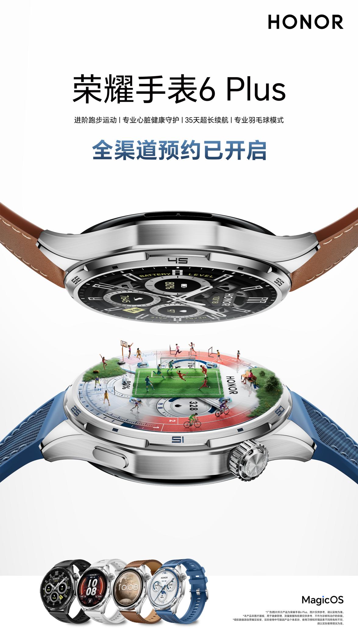 荣耀手表6 Plus现已在荣耀全渠道开启预售,预约8大权益——荣耀手机持机用户专享至高200元优惠;购机即赠价值149元表带;以旧换新最高补贴500元;至高6期免息分期;享受国补;超额礼赠①送价值830元家庭医生或咪咕视频钻石会员二选一;超额礼赠②送价值300元AI服务;超额礼赠③ 送价值170元表盘券&亲选购物券,多重好礼享不停,数量有限,先到先得。